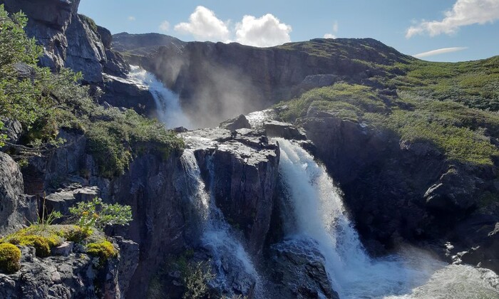 The Waterfall hike features a series of stunning waterfalls cascading toward the Tunulliarfik fjord. The route follows sheep trails through lush vegetation, offering beautiful views of the blue fjord and drifting icebergs all the way back to Igaliku.